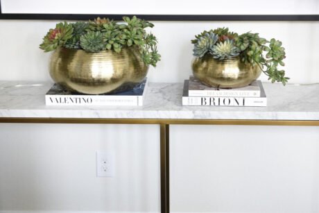 Delaney Gold Pot with Multiple Stems of Phalaenopsis Orchids and Succulents
