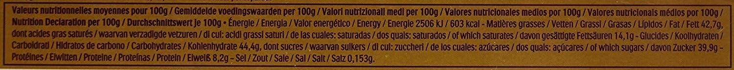 MILK Chocolate 30% (Sugar. Cocoa Butter. Cocoa Mass. Skimmed MILK Powder. Concentrated BUTTER. Emulsifier: Lecithins (SOYA). Vanillin). HAZELNUTS (28.5%). Sugar. Palm Oil. WHEAT Flour. Whey Powder (MILK). Fat-Reduced Cocoa. Emulsifier: Lecithins (SOYA). Raising Agent (Sodium Bicarbonate). Salt. Vanillin. Contains: Hazelnuts. Milk. Soya. Wheat.