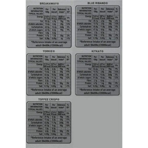 TOFFEE CRISP Biscuit pieces. crisped cereal (12%) and caramel (18%) covered in milk chocolate: Sugar. Vegetable fats (Palm. Coconut. Mango kernel. Sal. Shea. Sunflower. Palm kernel). Glucose syrup. Lactose and proteins from whey (from MILK). Whey powder [from MILK). Sweetened condensed skimmed MILK (Skimmed MILK. Sugar). WHEAT flour (contains Calcium. Iron. Thiamin and Niacin]. Dried whole MILK. Cocoa butter. Rice flour. Cocoa mass. Invert sugar syrup. Fat-reduced cocoa powder. Skimmed MILK powder. Malted WHEAT flour. BARLEY malt extract. Emulsifier (Sunflower lecithin). Malted BARLEY flour. Raising agents (Sodium bicarbonate. Calcium carbonate). Salt. Flavouring. BREAKAWAY Digestive biscuit covered with milk chocolate : Sugar. WHEAT flour (contains Calcium. Iron. Thiamin and Niacin). Wholemeal WHEAT flour (13%). Vegetable fats (Palm. Mango kernel. Sal. Shea). Dried whole MILK. Cocoa butter. Cocoa mass. Lactose and proteins from whey (from MILK). Whey powder (from MILK). Whole OAT flour (3%). Skimmed MILK powder. BARLEY malt extract. Dried coconut. Emulsifier (Sunflower lecithin). Salt. Raising agents (Ammonium bicarbonate. Sodium bicarbonate). BLUE RIBAND Crisp wafer biscuit covered in real milk chocolate : Sugar. WHEAT flour. Vegetable fats (Palm. Shea). Cocoa butter. Whole MILK powder. Cocoa mass. Whey powder (from MILK). Maltodextrin. Fat-reduced cocoa powder. Emulsifier (Lecithins). Raising agent (Sodium bicarbonate). Salt. Flavourings. May contain PEANUTS. TREE NUTS and SOYA. KITKAT Two crisp wafer fingers covered with milk chocolate (66%) : Sugar. WHEAT flour (contains Calcium. Iron. Thiamin and Niacin). MILK powders (whole and skimmed). Cocoa mass. Cocoa butter. Vegetable fats (Palm. Shea. Mango kernel. Sal). Lactose and proteins from whey (from MILK). Whey powder (from MILK). Butterfat (from MILK). Emulsifier (Lecithins). Yeast. Raising agent (Sodium bicarbonate). Natural flavourings.