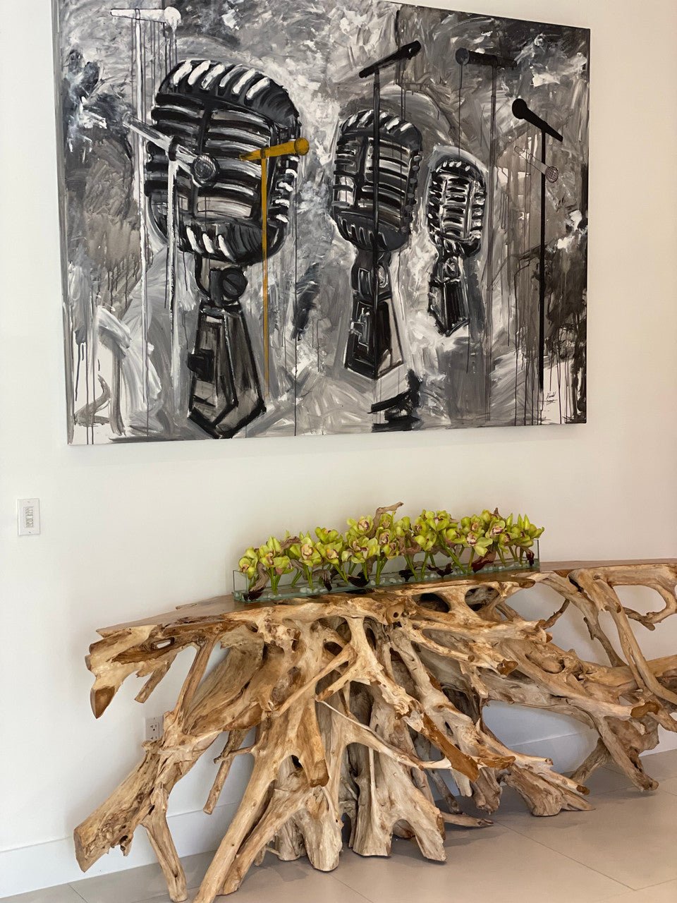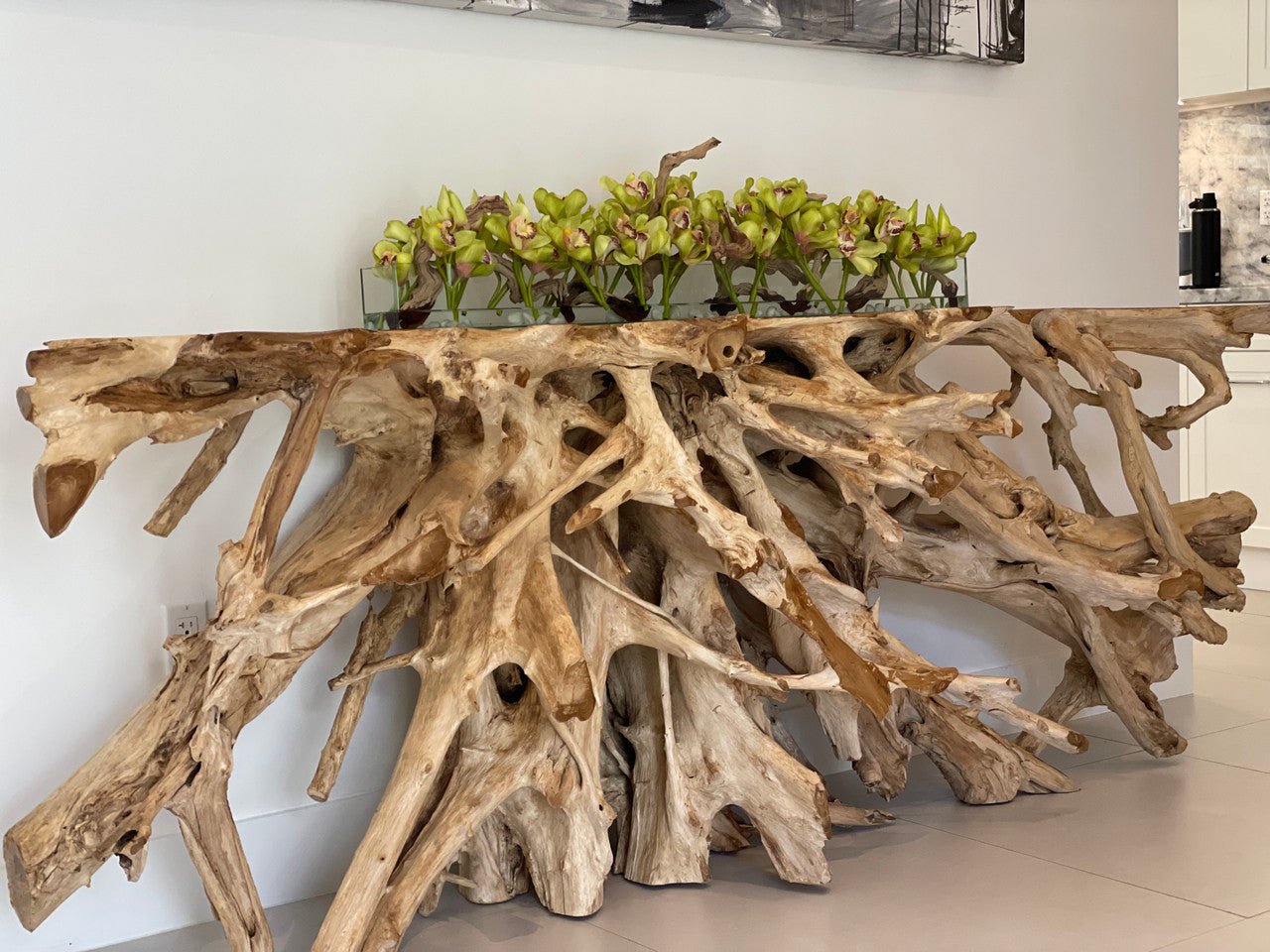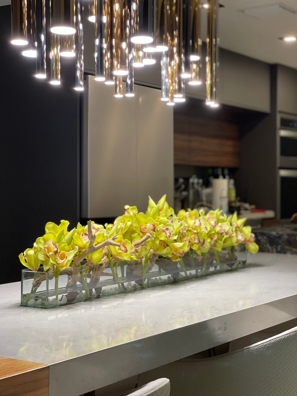 48″ Casa Moderna glass plate planter with multiple stems of green Cymbidium orchids. sand blasted grapewood and white stones anchored in our illusion water