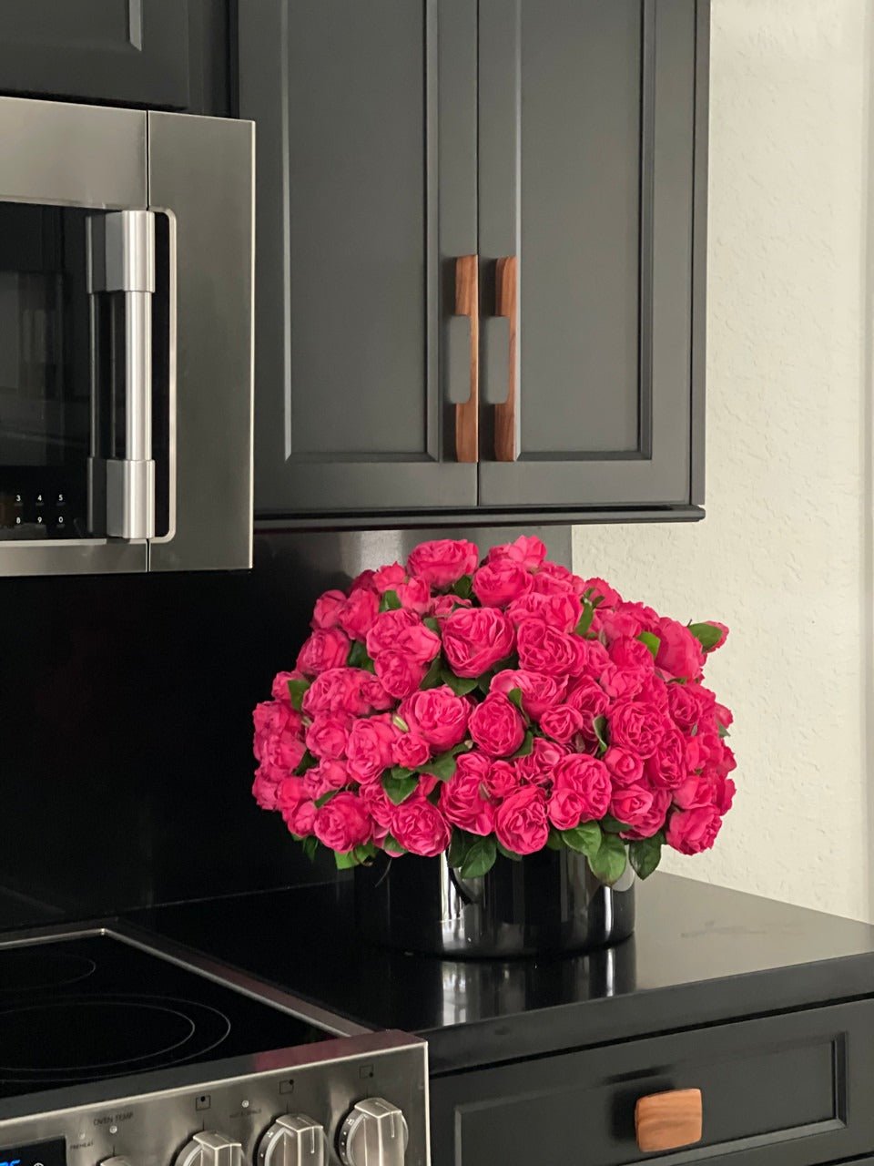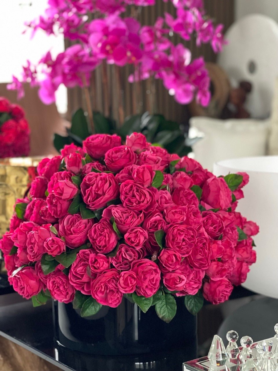 An exquisite exhibition unfolds as a cluster of deep pink English roses burst into bloom. Adorned with fully blossomed. partially bloomed. and delicately unfurling rose buds. they are artfully arranged within a sleek black glass vase. adding a timeless touch of organic allure. This unstructured composition. with its vibrant dark pink hue harmoniously contrasting against the obsidian vessel. evokes an atmosphere of refined grace and fervent ardor.