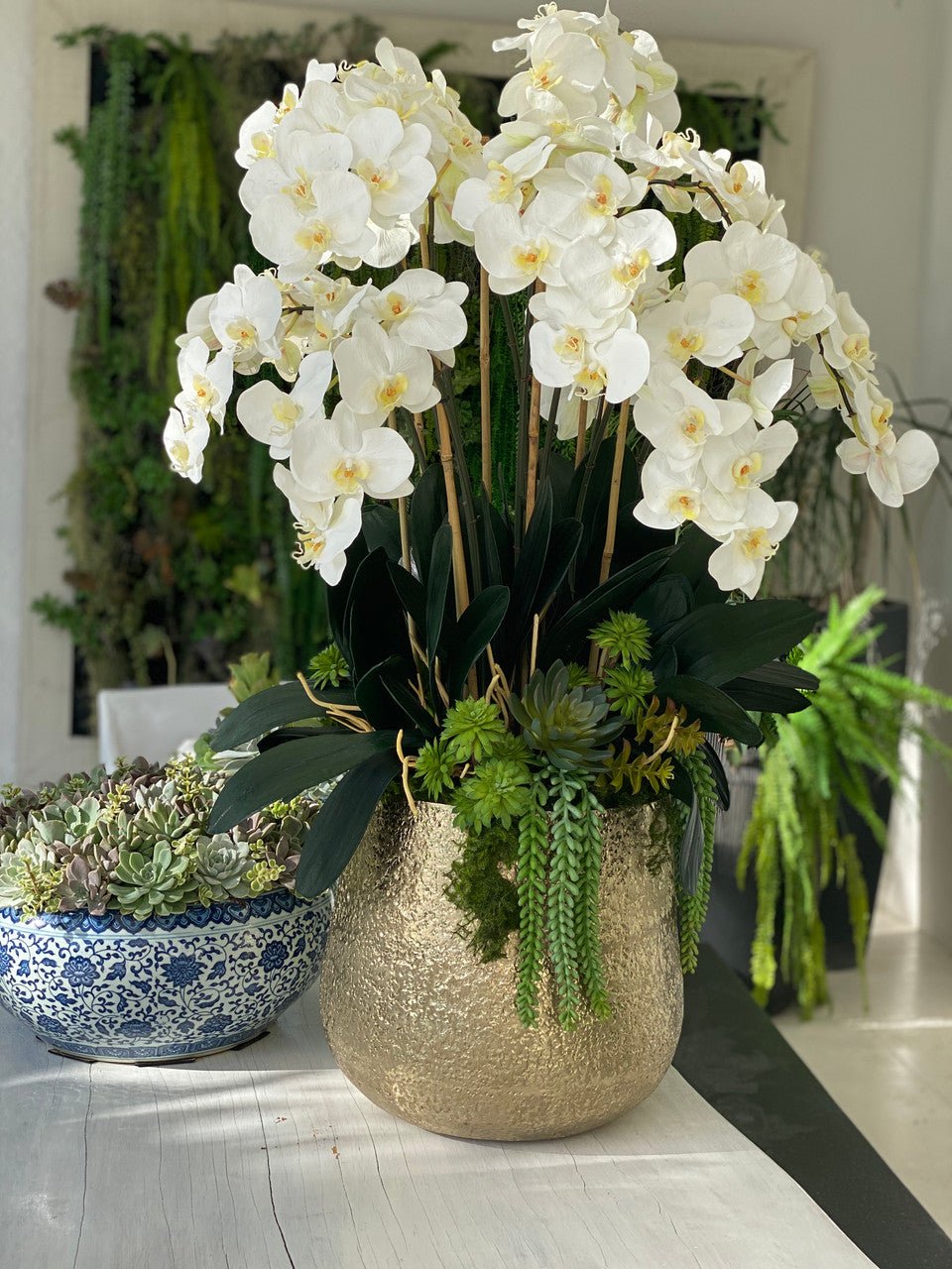 Often called the moth orchid. the Phalaenopsisis a favorite among our designers for its dense leaves. elegantly arching sprays. and lovely white blooms. Our remarkably lifelike arrangement is staked into a moss-covered Delany textured gold pot.Exceptional craftsmanship is presented at spectacular scale in this gorgeous white Phalaenopsis arrangement. showcased the Delany Pot which is cast from aluminum. then polished and electro-plated for a textured gold finish and simple silhouette. It’s designed for drama and destined to get attention: Display it on your dining room tabletop. or let this Phalaenopsis orchid make a great first impression in the foyer.