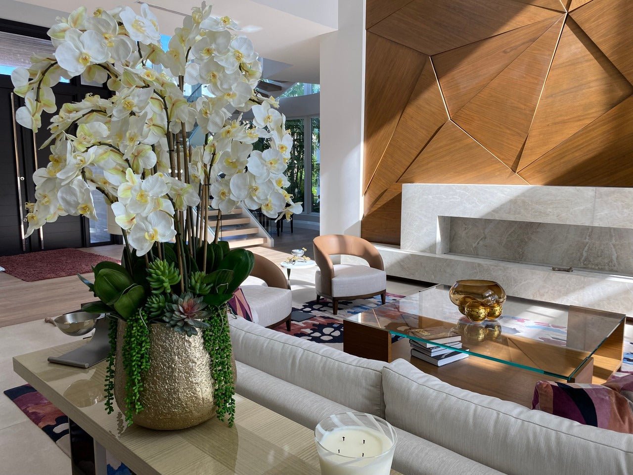 Large-scale mix of faux white Phalaenopsis orchid blooms and green foliage. displayed in our Delany pot.