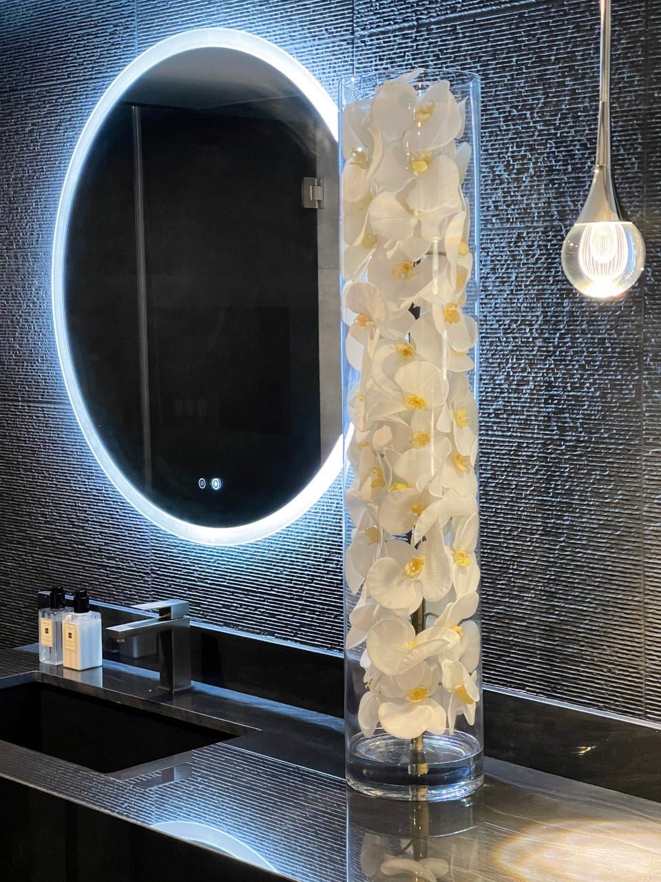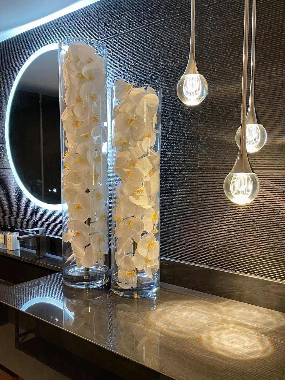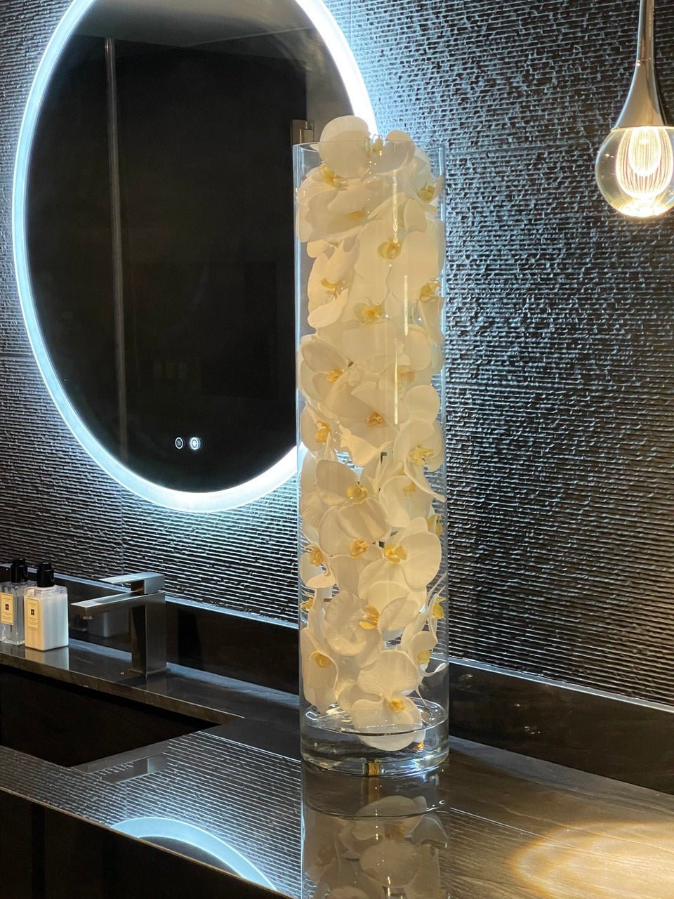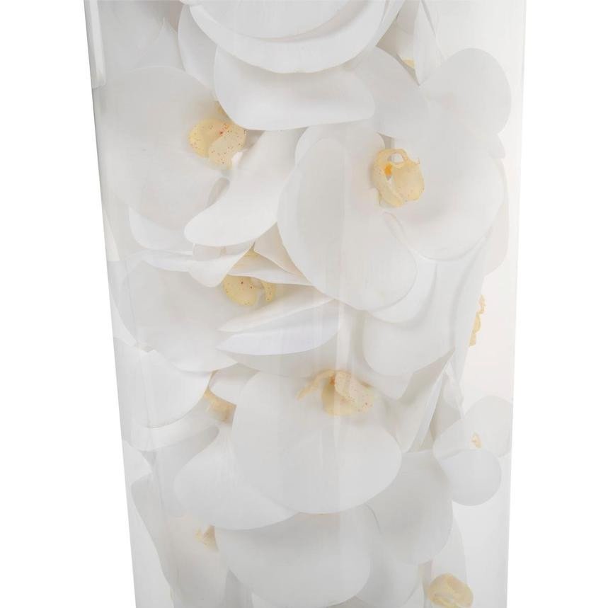 White phalaenopsis orchids anchored in Illusion water- completely contained inside a glass cylinder for a modern and sophisticated look. Grouped in three different sizes (40. 32. and 28). paired or elegantly standing alone. the simplicity of this vase makes it perfect for any space and decor style.These white phalaenopsis orchids in cylinder vase are also great for any event. These vases are very versatile and can be used for any occasion. whether you are in need for an attractive centerpiece or a stunning and sophisticated home glass decor.Hand-blown crystal clear glass not machine made. Crafted with thick glass and a stable bottom for the perfect table centerpiece.