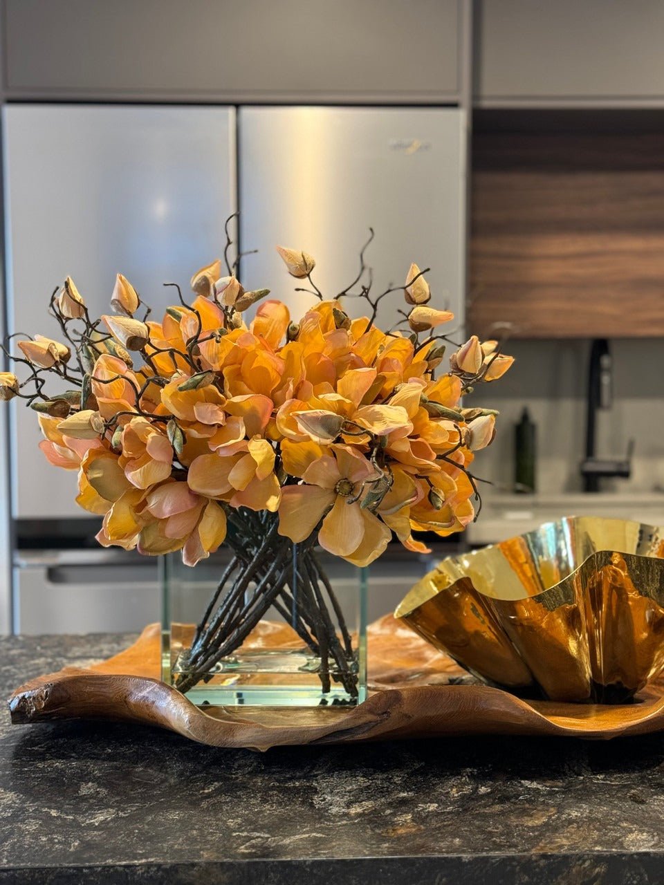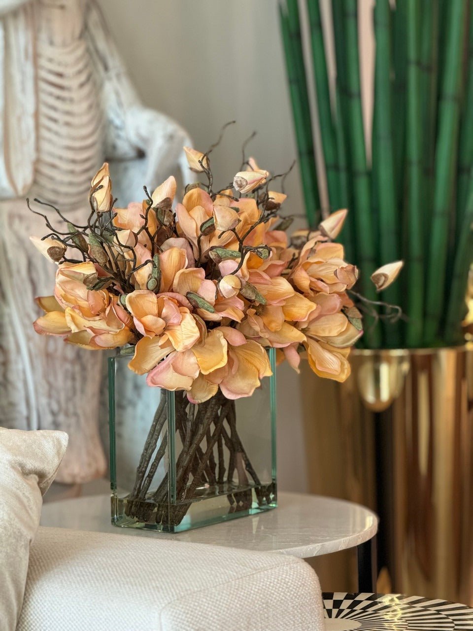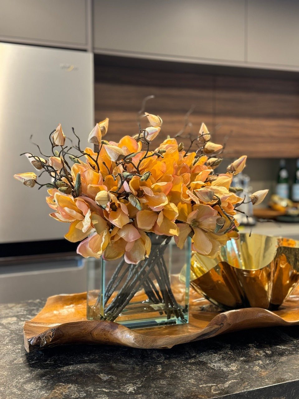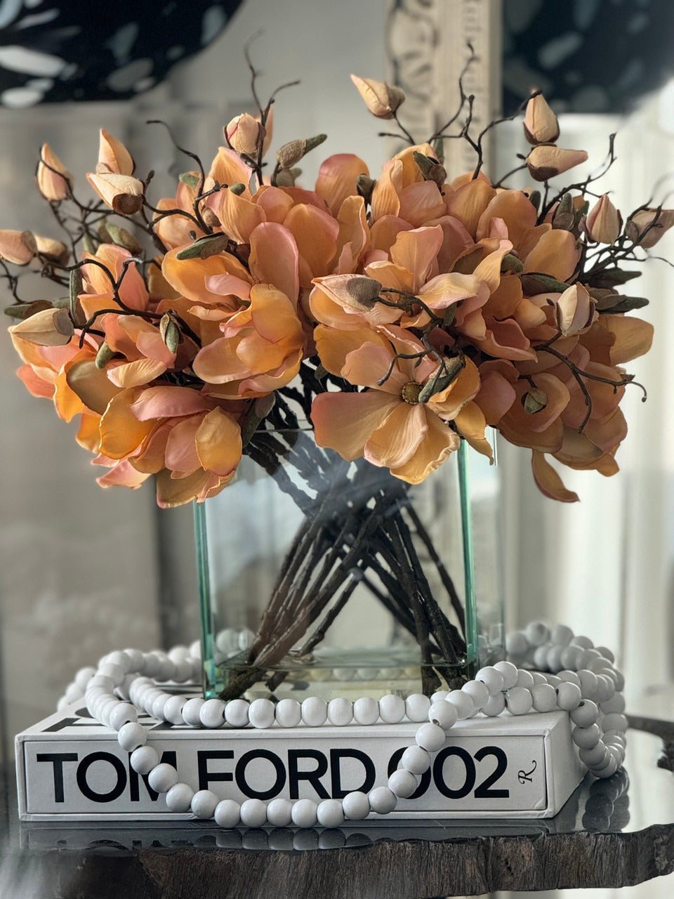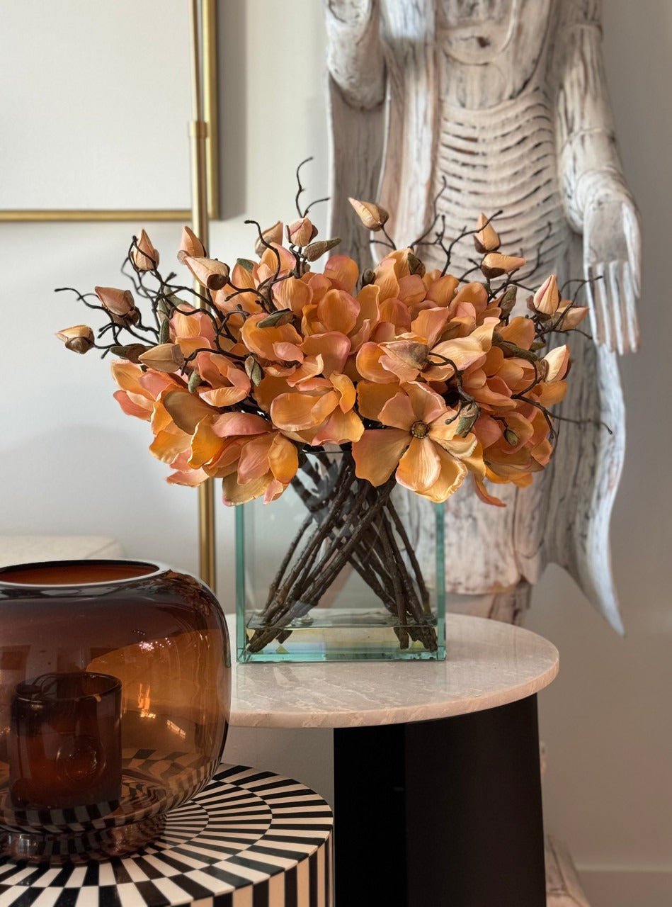 Square Casa Moderna glass planter with multiple stems of peach OR white magnolia blossoms. foliage and sand blasted grape wood anchored in our illusion water. Enjoy beautiful. lifelike magnolia tree branches that won’t fade after spring awakens. Displayed here in a stylish clear glass planter. magnolia flowers are cheerful and elegant in any season. Each hand-placed blossom and leaf is crafted with vivid color and exceptional detail. a tribute to Mother Nature’s artistry. Showcase this lovely faux tree on your dining table or living room tabletop.