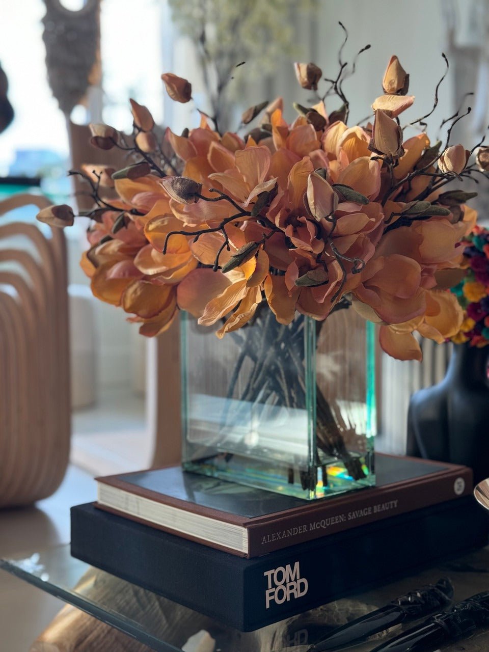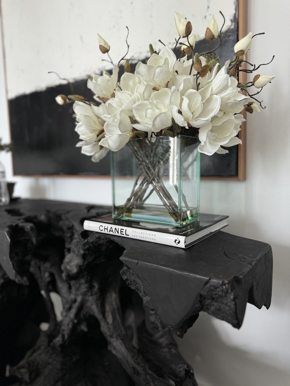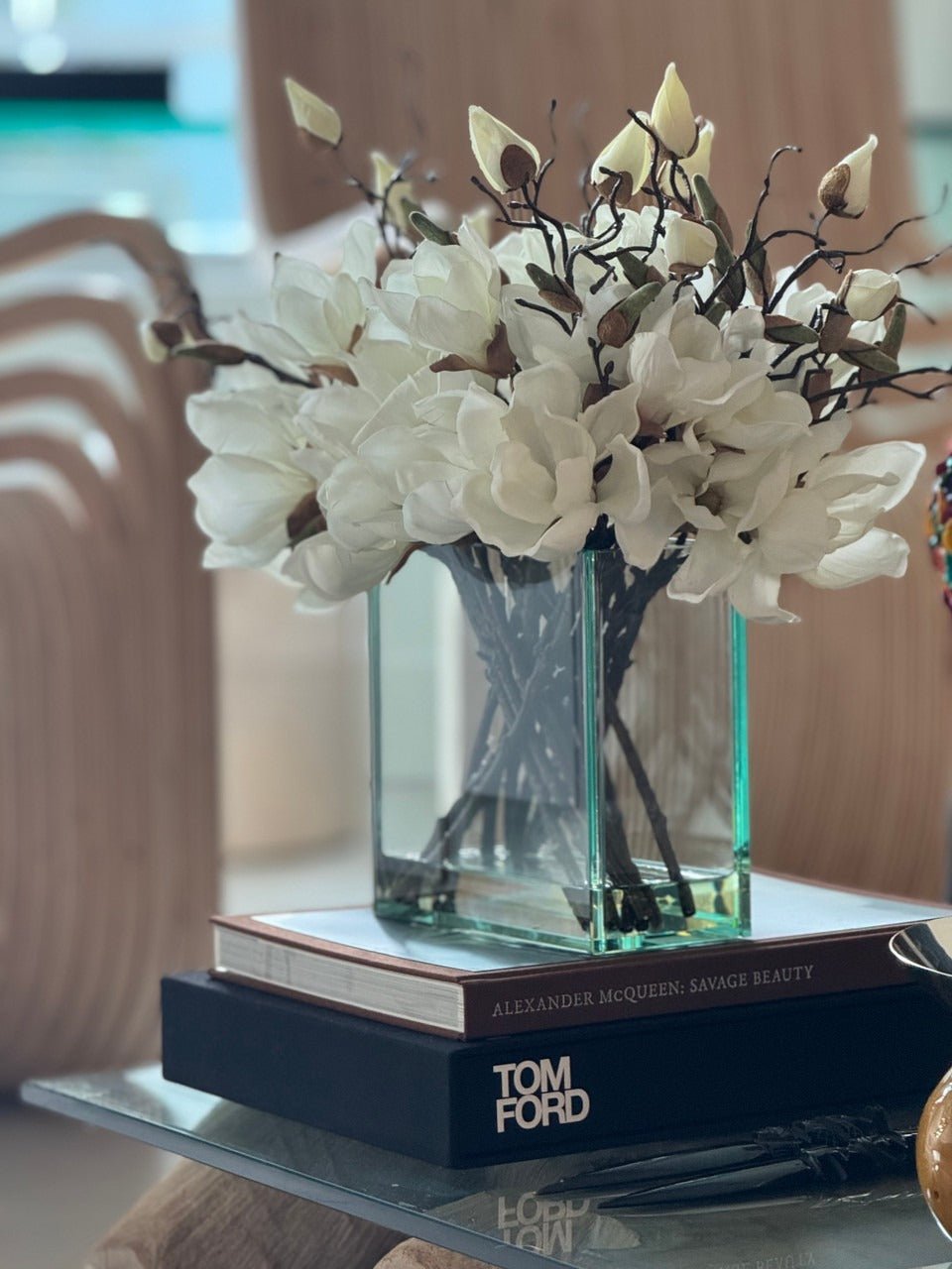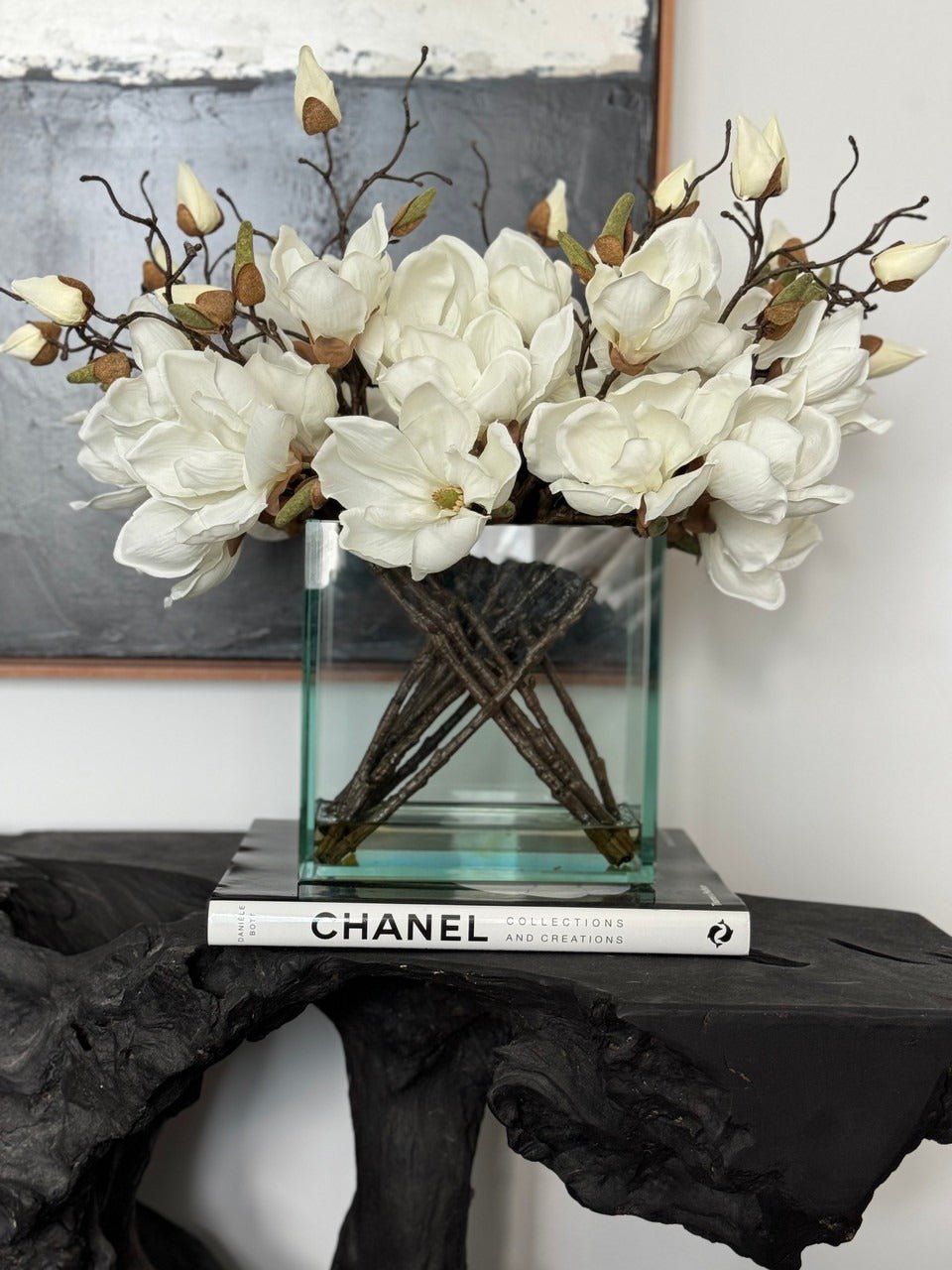 Square Casa Moderna glass planter with multiple stems of peach OR white magnolia blossoms. foliage and sand blasted grape wood anchored in our illusion water. Enjoy beautiful. lifelike magnolia tree branches that won’t fade after spring awakens. Displayed here in a stylish clear glass planter. magnolia flowers are cheerful and elegant in any season. Each hand-placed blossom and leaf is crafted with vivid color and exceptional detail. a tribute to Mother Nature’s artistry. Showcase this lovely faux tree on your dining table or living room tabletop.