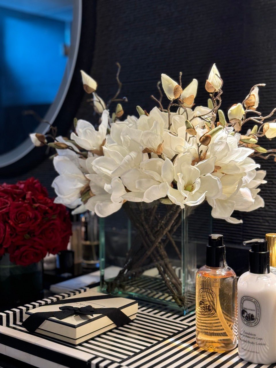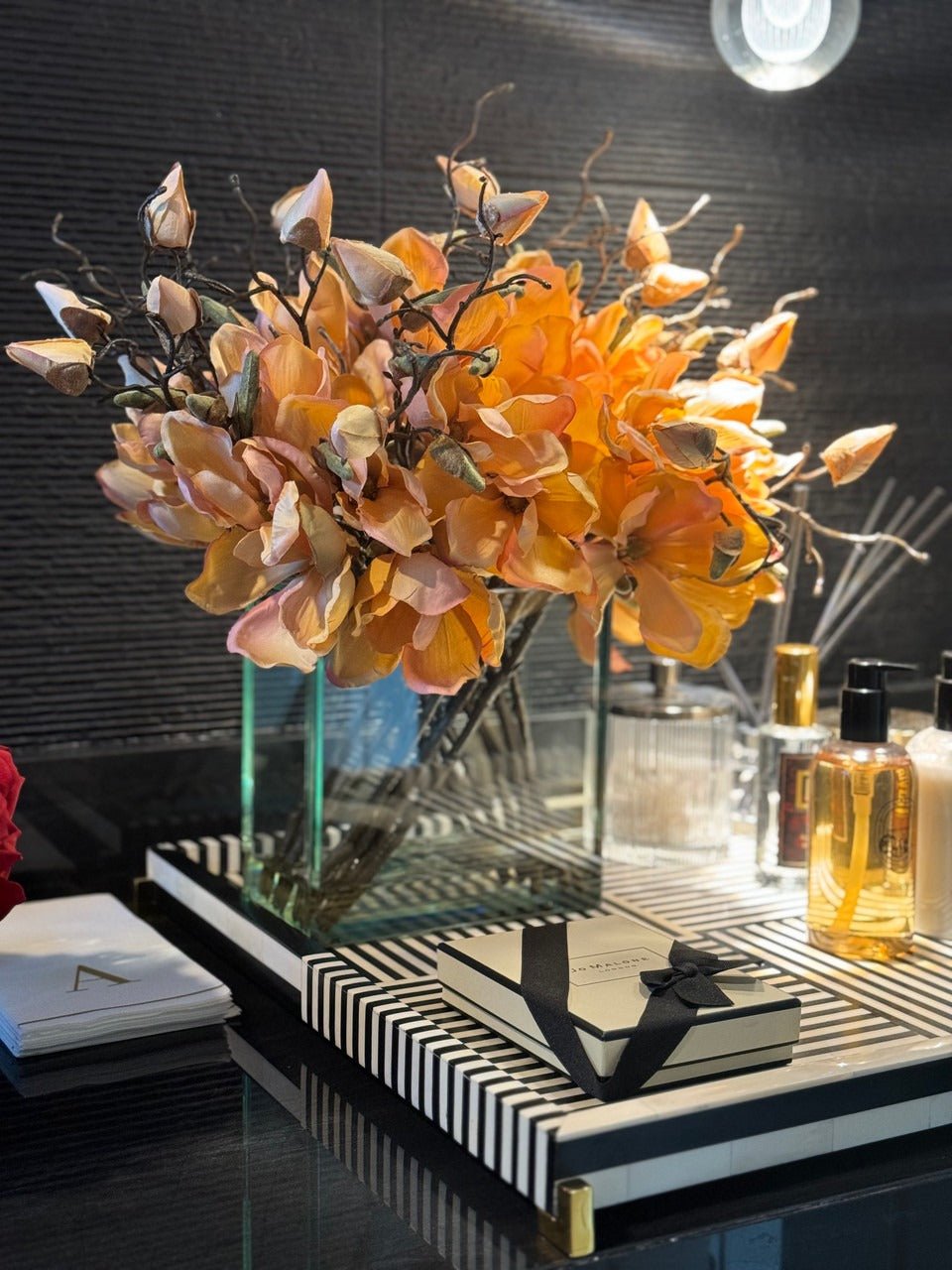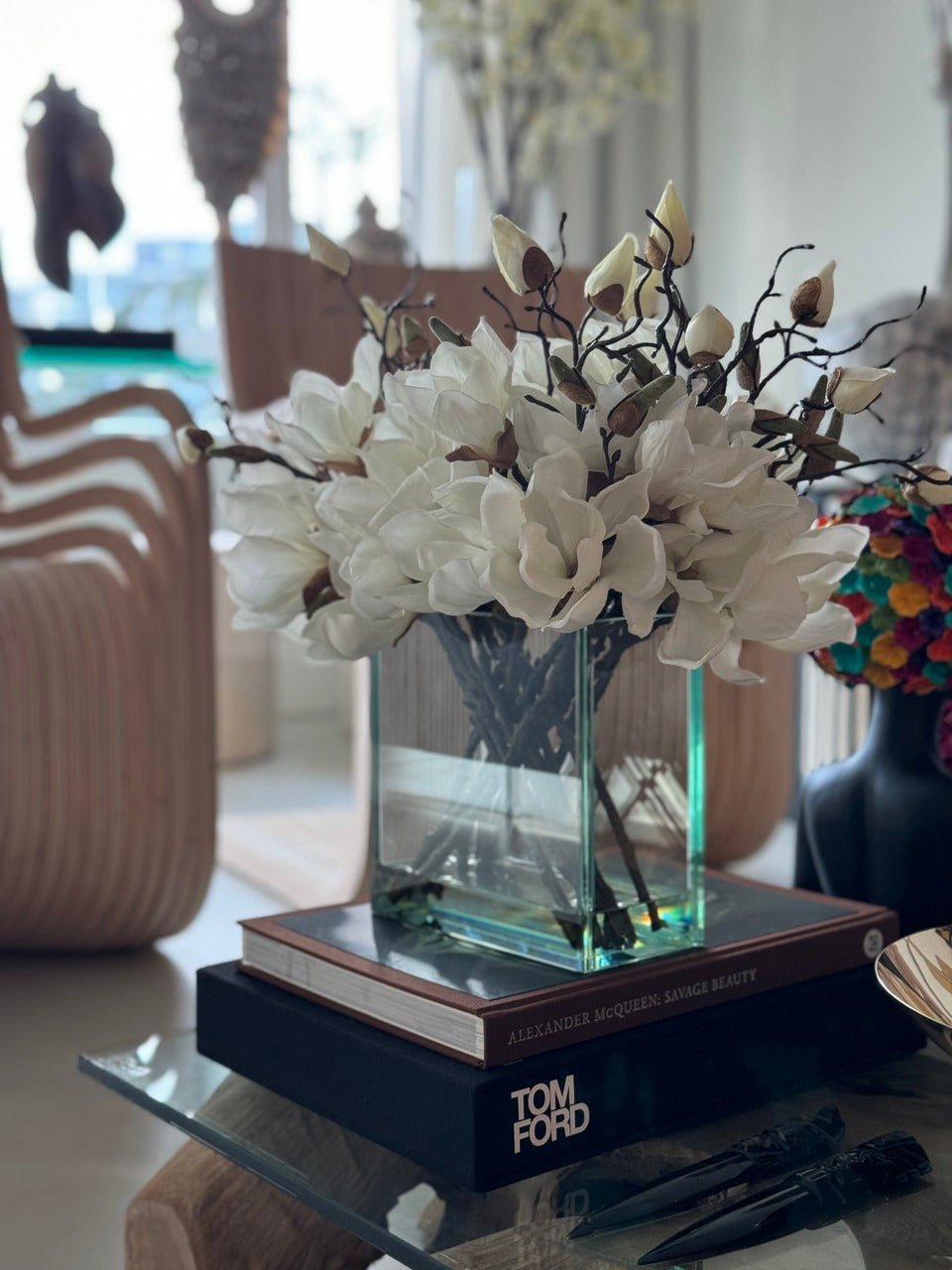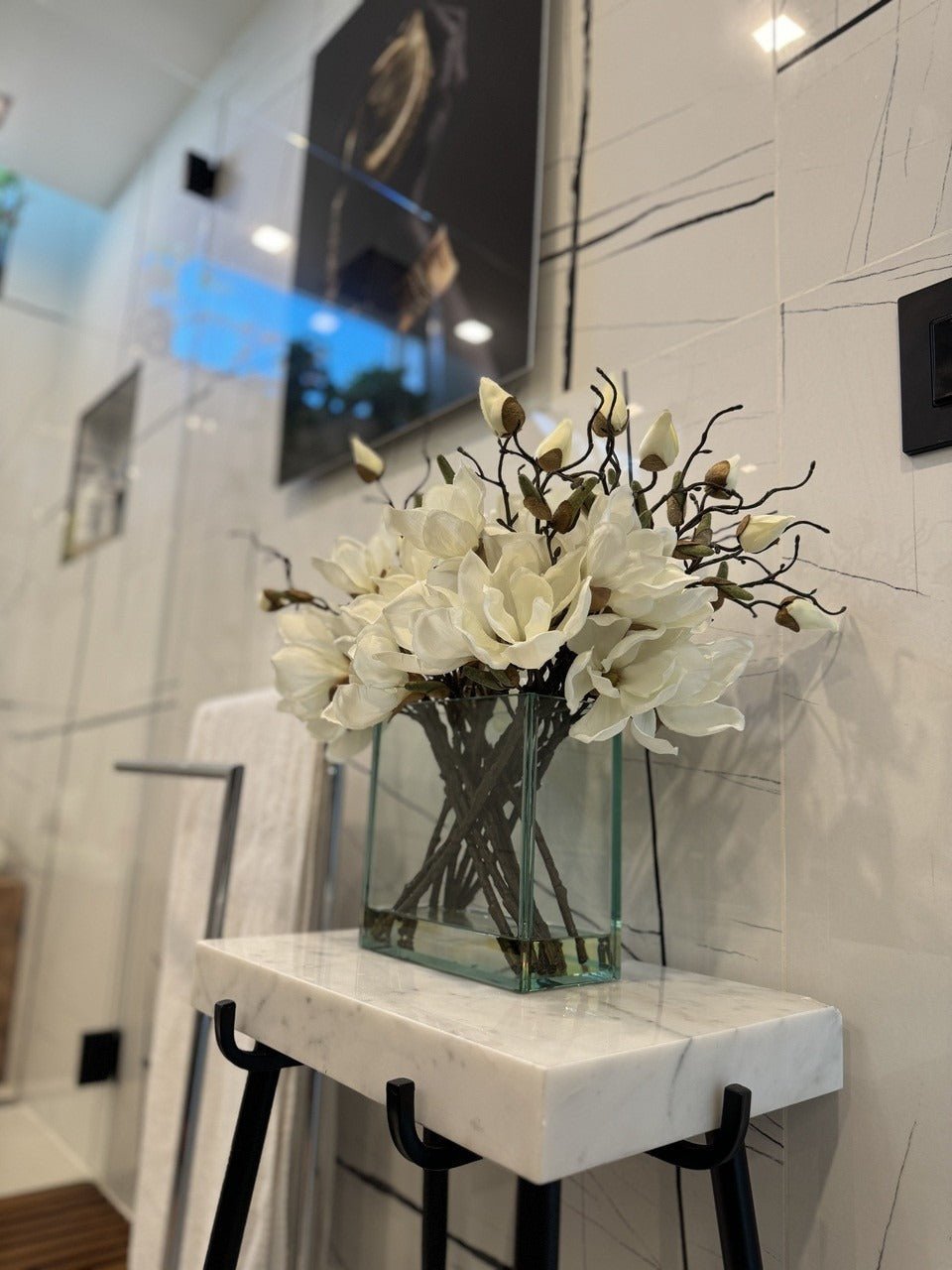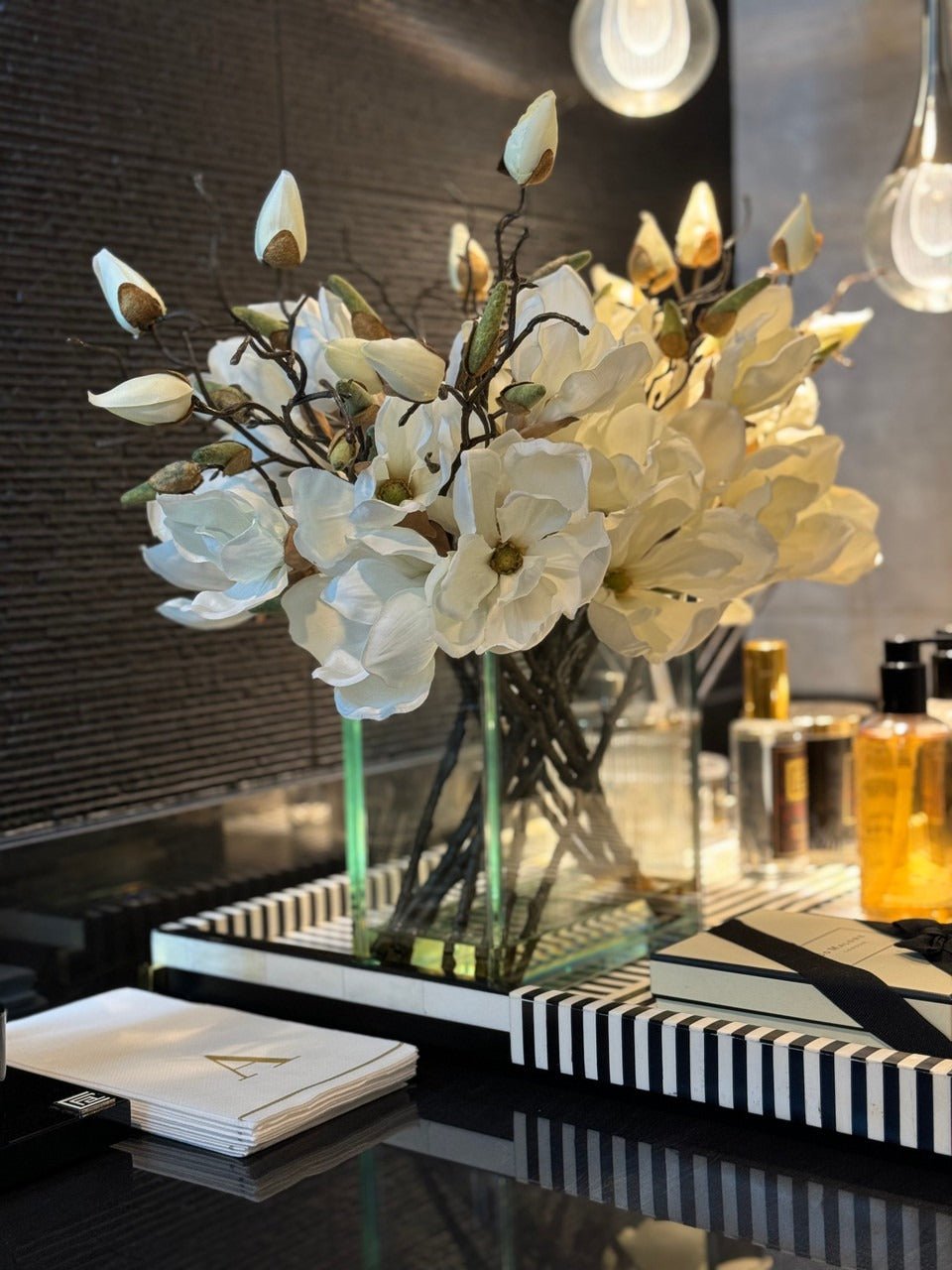 Square Casa Moderna glass planter with multiple stems of peach OR white magnolia blossoms. foliage and sand blasted grape wood anchored in our illusion water. Enjoy beautiful. lifelike magnolia tree branches that won’t fade after spring awakens. Displayed here in a stylish clear glass planter. magnolia flowers are cheerful and elegant in any season. Each hand-placed blossom and leaf is crafted with vivid color and exceptional detail. a tribute to Mother Nature’s artistry. Showcase this lovely faux tree on your dining table or living room tabletop.