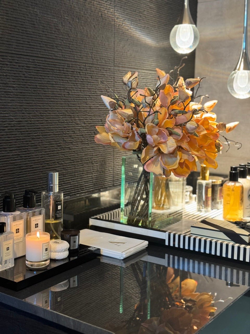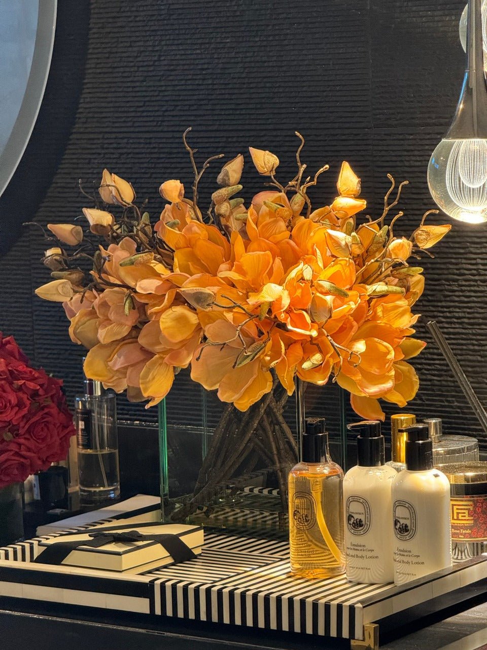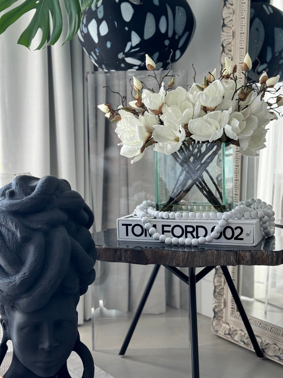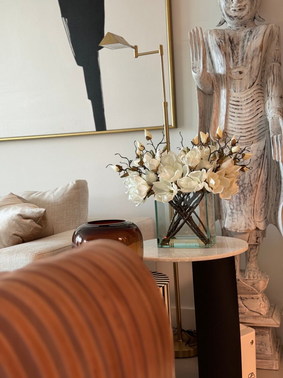 Square Casa Moderna glass planter with multiple stems of peach OR white magnolia blossoms. foliage and sand blasted grape wood anchored in our illusion water. Enjoy beautiful. lifelike magnolia tree branches that won’t fade after spring awakens. Displayed here in a stylish clear glass planter. magnolia flowers are cheerful and elegant in any season. Each hand-placed blossom and leaf is crafted with vivid color and exceptional detail. a tribute to Mother Nature’s artistry. Showcase this lovely faux tree on your dining table or living room tabletop.